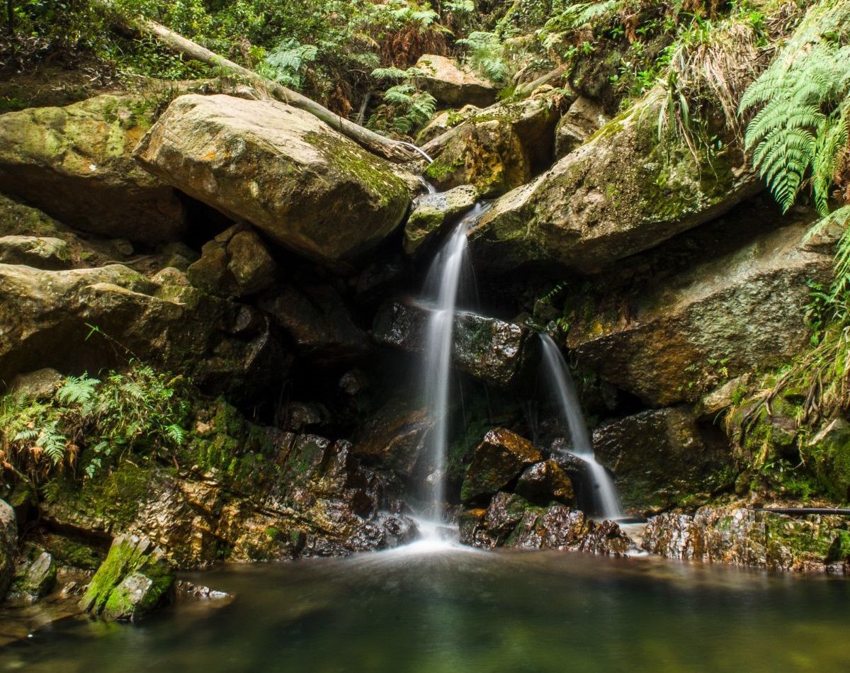 Izq. Senderos en medio de pineras son muy comunes en los Cerros Orientales de Bogotá. - Der. Pequeñas cascadas adornan el sendero por la Quebrada Las Delicias.